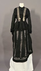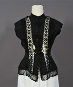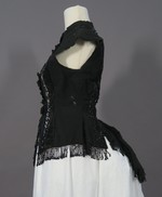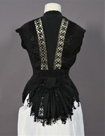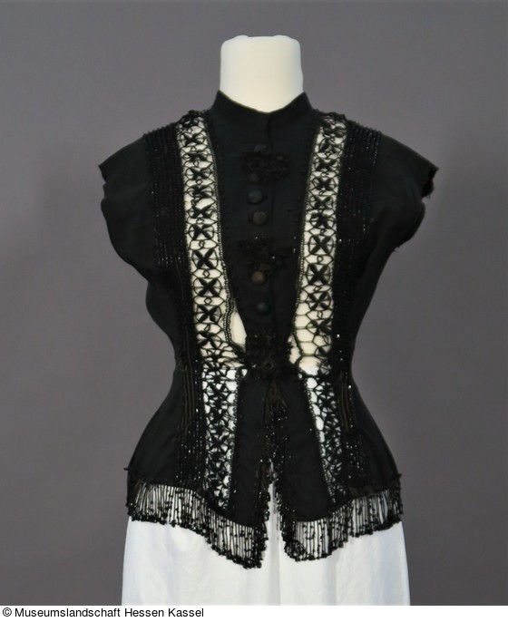 Über die Schultern verläuft vom vorderen Saum zum hinteren Taillenriegel je eine breite schwarze, geklöppelte Einsatzspitze, die auf der Schulterseite von einer perlenbesetzten Tressenborte und auf der Innenseite von einer einfachen Perlenreihe flankiert wird.