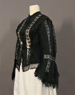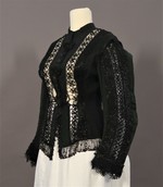 Hüftlange Damenjacke aus schwarzem Wollstoff mit kleinem Stehkragen und Spitzeneinsätzen. Bestandteil einer Trauergarderobe.