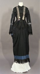 Vorder- und Seitenteile der Jacke sind gefüttert und die Knopfleiste sowie die vorderen und hinteren Teilungsnähte durch Fischbein versteift. Vermutlich wurde sie über einer Bluse o.ä. getragen. Zu einem späteren Zeitpunkt wurde die Hüftpartie enger gemacht. (Wechsel von Tournüre zu Cul?)