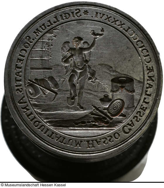 Dass man in Kassel mit dem ersten Siegel nicht zufrieden war, belegt ein Brief Casparsons an den Landgrafen, der vom Herbst 1787 stammen muss und in dem er sich erlaubt „auch ein vom Rath Tischbein gezeichnetes Siegel nebst seiner Beylage zu weiterer gnadigster Entschließung wegen seiner unmaßgeblichen beßeren Ausführung durch den Graveur zu Hanau, ehrerbietig zu übergeben.“ Ein Jahr später ging der Auftrag wiederum nach Hanau, in die alte Heimat des Landgrafen, diesmal jedoch an den bekannten Münzgraveur Carl Ludwig Holtzemer. Seine Rechnung über „vierzig Thaler Niederhessische Wehrung“ stammt vom 28. Januar 1788. Es wurde nun also mehr als das Doppelte bezahlt. Aber auch das erste, misslungene Siegel wurde aufbewahrt, was die schriftliche Überlieferung enorm anschaulich macht.