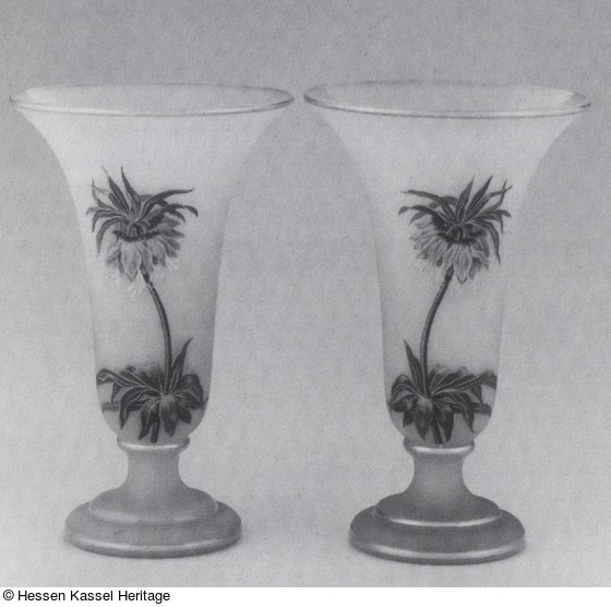 Hellgraues Opalglas mit mattierter Oberfläche, polychrome Emailmalerei, vergoldet. |