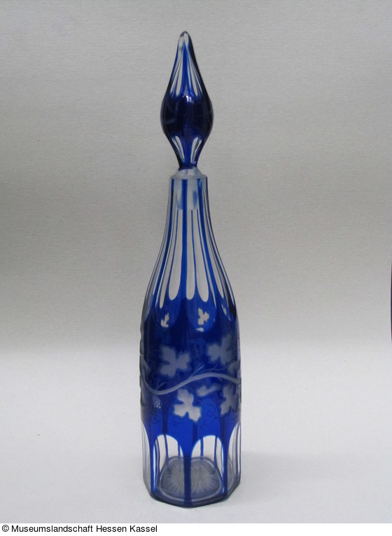 Farbloses Glas mit tiefblauem Überfang und Tiefschnitt, geätzt, Schälschliff. |