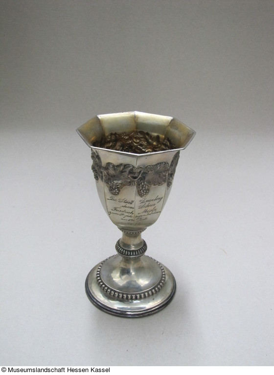 Auf der Standfläche Etikett: Theodor Meissel, Juwelier, Gold- und Silberarbeiter in Cassel, ob. Johannis-Strasse No. 237.; am Fußrand: N 12 (Punzen: N im Rechteck (Hersteller) und 12 (Lot)); Die Stadt Zierenberg ihrem Lehrer Friedrich Mösta zum 50-jährigen Jubiläum am 6ten Juli 1852. (Gravur);