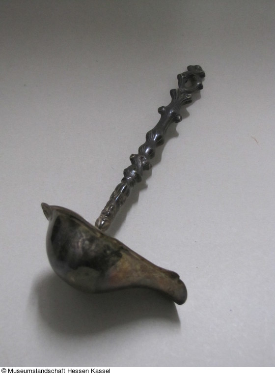 Bronze, versilbert. Griff aus zwei waagrechten, Kellenansatz aus zwei senkrechten gestanzten Schalen zusammengesetzt, Kelle gedrückt, druckpoliert.