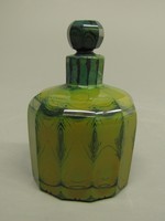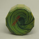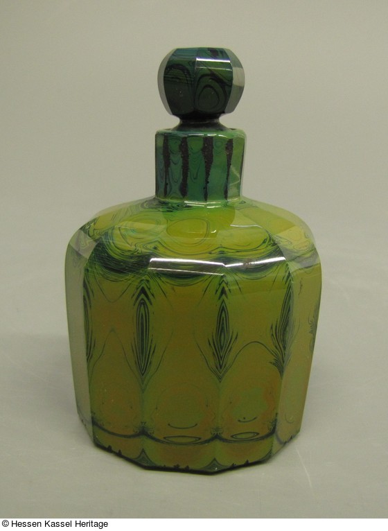 Blaues Glas mit Farbbeizen in Ocker und Grün, Flachschliff. |