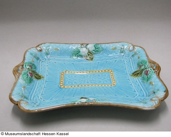 Steingut ("Majolica"), farbiger Dekor in Flachrelief. |