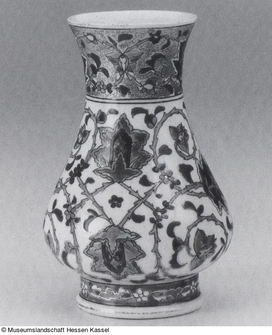 Fayence, grauer Scherben, crèmefarbene Grundglasur, mehrfarbiger Dekor: Abstufung von Rot, Grün, Blau und Gelb; Gold in unterschiedlicher Anwendung. |