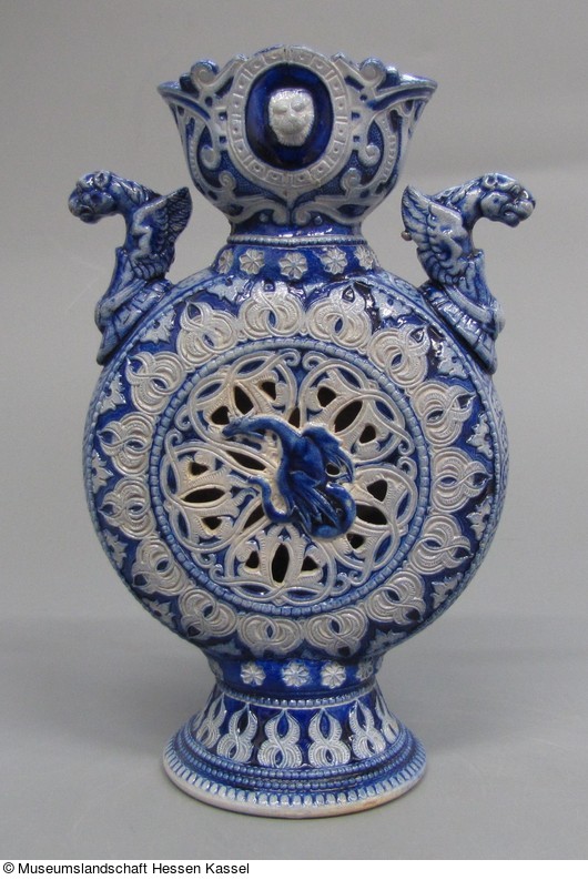 Beige-graues salzglasiertes Steinzeug, Reliefdekor, teilweise durchbrochen; die Vertiefungen mit Kobaltsmalte ausgefüllt. |