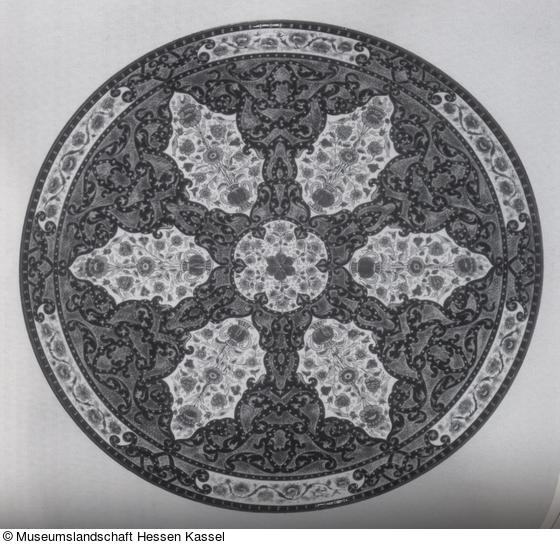 Fayence, heller Scherben, crèmefarbene Grundglasur; polychromer Dekor in persischer Art mit Blattmedaillons. |