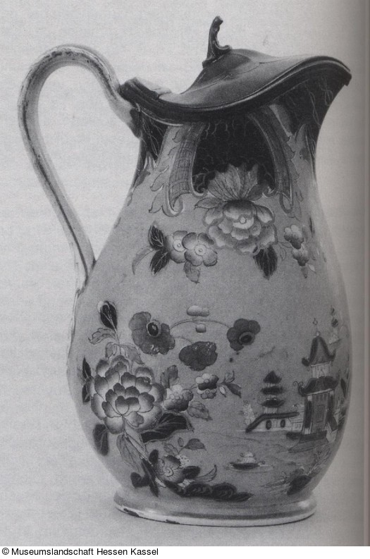 Steingut, weißer Scherben, in die Form gegossen. Reicher Aufglasurdekor, teilweise mit Gold. |