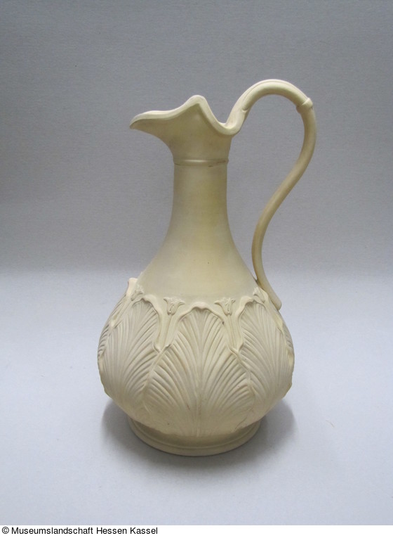 Steinzeug, in die Form gegossen und mit einer matten, hellockerfarbenen Engobe überzogen. |