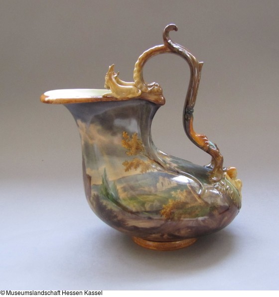 Das Gefäß kopiert einen in Pompeji gefundenen bronzenen Askos, dessen Form dem ursprünglich ledernen Weinschlauch (ἀσκός askós „Schlauch“) folgt. Die Wandung zeigt ein Gemälde mit südlicher Herbstlandschaft und Ruine.