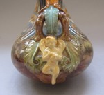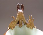 Porzellan, glasiert, Handbemalung, eingebrannt, Ziegenböcke aufmodelliert. |