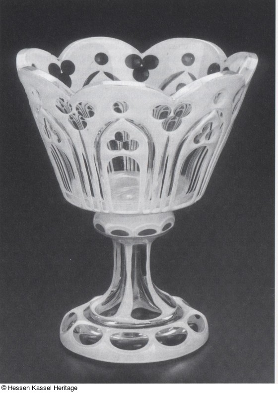 Die Rückbesinnung der um 1800 entstandenen Romantik auf das Mittelalter, in deren Folge auch Renaissance und Barock eine neue Wertschätzung erfuhren, führte im Kunstgewerbe bis etwa zum Ende des Jahrhunderts zur Popularität historisierender Formen. – Die zurückhaltend gotisierende Schale ist mit zweifachem Überfang (zinnweiß, farblos) versehen. Das dünn zu verarbeitende, lichtundurchlässige Zinnweiß eignet sich besonders für geschnittenen und geschliffenen Dekor.
