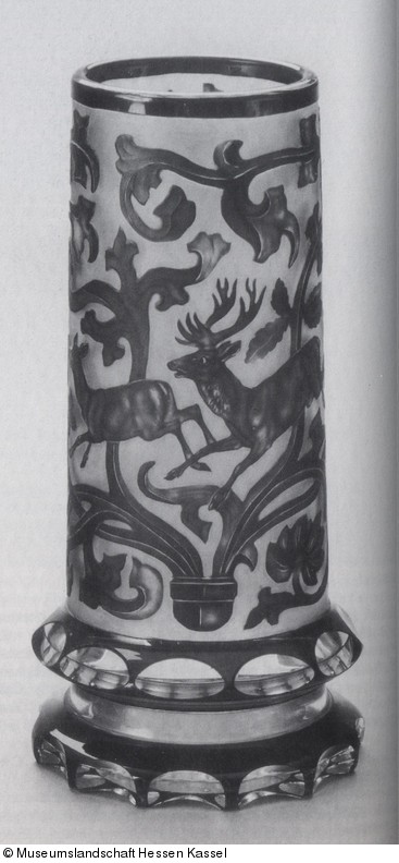 Die Rückbesinnung der um 1800 entstandenen Romantik auf das Mittelalter, in deren Folge auch Renaissance und Barock eine neue Wertschätzung erfuhren, führte im Kunstgewerbe bis etwa zum Ende des Jahrhunderts zur Popularität historisierender Formen. – Die Wandung zeigt auf mattem Fond die aus dem blauen Überfang herausgeschliffener Darstellung eines fliehenden Hirsches mit Hirschkuh, umrankt von in spätgotischem Blattwerk. Obwohl unsigniert, ist diese Arbeit auf Grund vergleichbarer Gläser dem Glasschneider Franz Paul Zach zuzuschreiben.