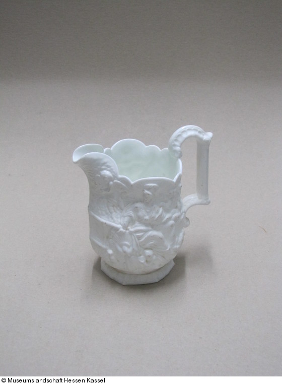 Das Relief überzieht die gesamte Wandung des Gefäßes, nach zwei Schauseiten ausgerichtet: zwei allegorische Frauengestalten. Die Bezeichnung der Figuren (wisdom: Weisheit, providence: Vorsehung) findet sich auf der Unterseite des Kännchens. Das für Reliefdekor besonders geeignete Parian-Feinsteinzeug wurde von englischen Firmen seit etwa 1830 bevorzugt für Kannen und Krüge verwendet.