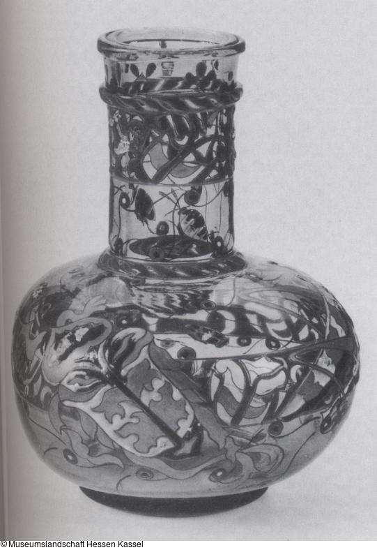 Olivfarbenes Glas, Emailmalerei, Blatt- und Pudergold. |