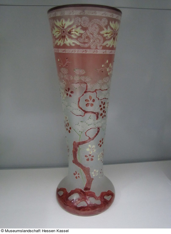 Farbloses Glas, geätzt, Emailfarbendekor, Kaltbemalung. |