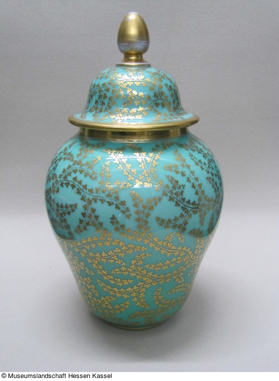 Als Vorbild für die Form der bauchigen Deckelvase mit zapfenförmigem Knauf dienten chinesische Porzellanvasen. Vergleichbarer Golddekor findet sich auf indischen Glasvasen des 17. Jahrhunderts. Die Verbindung beider Einflüsse verweist auf den Geschmack des Historismus.