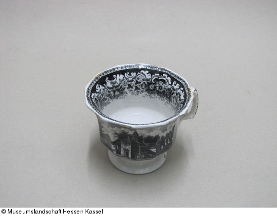 Bei dem um 1780 in England entwickelten Umdruckverfahren wird das in eine Metallplatte gravierte Motiv, u. U. einem Vorlagenwerk entnommen, mittels eines dünnen Papieres oder einer Gelatineplatte abgenommen und in der Art eines Abziehbildes auf das keramische Objekt übertragen. – Bedruckte Steingutware wurde so zum Ersatz für das teure, bemalte Porzellan. Besonders beliebt waren von Anfang an topographische Ansichten. Die Wandung der Tasse zeigt Schweizer Ansichten, benannt "Stoos i.d. Schweiz".