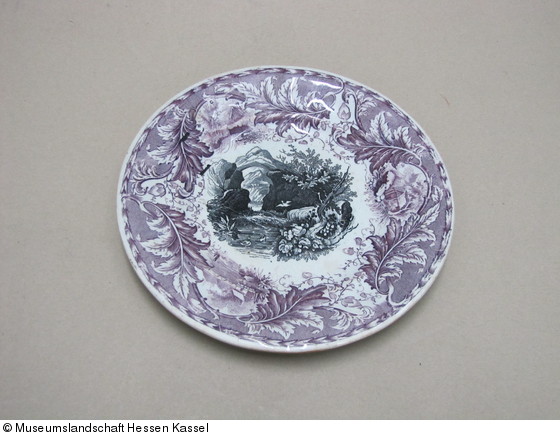 Bei dem um 1780 in England entwickelten Umdruckverfahren wird das in eine Metallplatte gravierte Motiv, u. U. einem Vorlagenwerk entnommen, mittels eines dünnen Papieres oder einer Gelatineplatte abgenommen und in der Art eines Abziehbildes auf das keramische Objekt übertragen. – Bedruckte Steingutware wurde so zum Ersatz für das teure, bemalte Porzellan. Besonders beliebt waren von Anfang an topographische Ansichten.