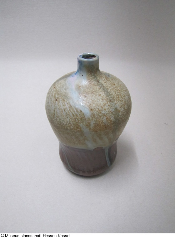 Steinzeug, hellgrauer Scherben, formgefertigt mit gesondertem Bodenteil, Schicht- und Laufglasuren. |