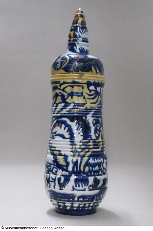 Fayence, fast weißer Scherben, in die Form gegossen; weiße Grundglasur, polychrome Unterglasurbemalung. |