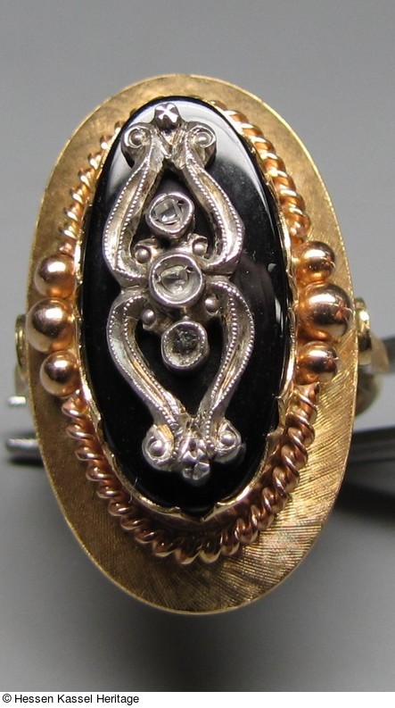 Goldener Ring mit längsovaler Ringplatte und Diamantbesatz auf schwarzem Onyx |