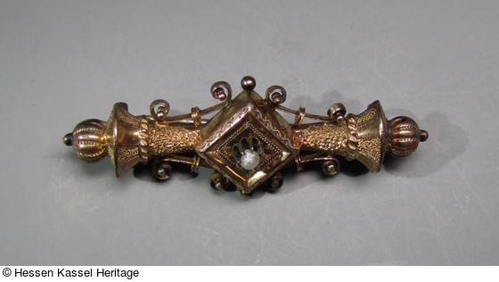 Silber vergoldet, gedrückt, punziert, graviert. Halbe Perle. |