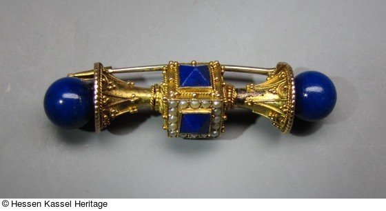 Kupfervergoldete Brosche mit Lapislazuli- und Perlenbesatz |