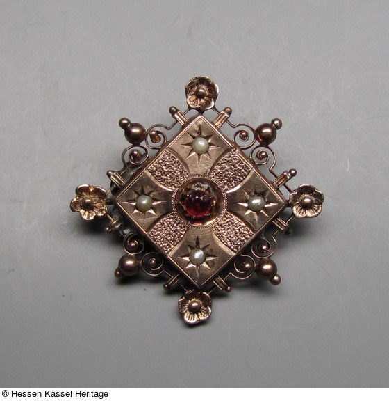 Goldene, quadratische Brosche mit einem Almandin und vier Saatperlen |