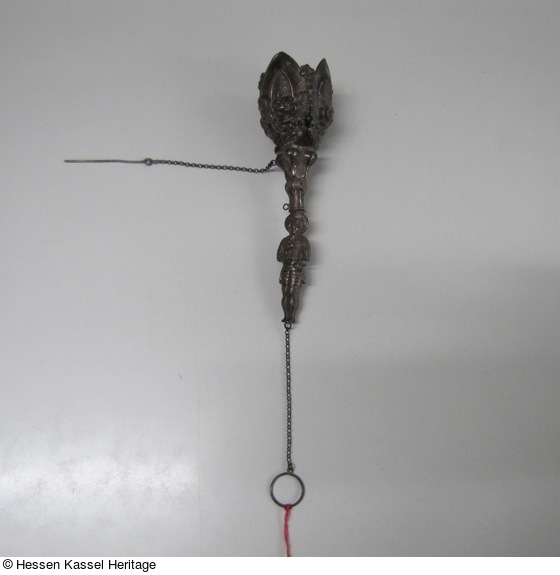 Silberblech gedrückt, der Griff ist aus zwei Teilen, der Kelch aus vier gleichen Blechen verlötet. Zwei Erbsketten mit Ring und Ansteckdorn. |
