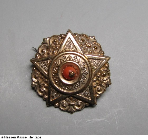 Silbervergoldete Scheibenbrosche mit Stern und eingeschriebenem Kreis, mit Korallenkugel besetzt