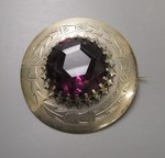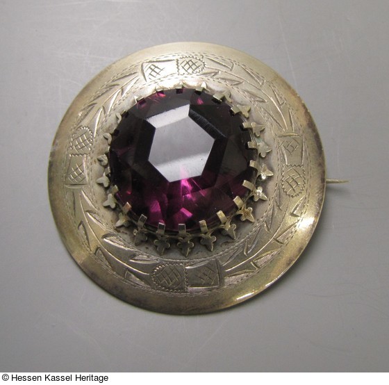 Silberne Scheibenbrosche mit graviertem Distelornament und Glassteinen