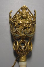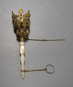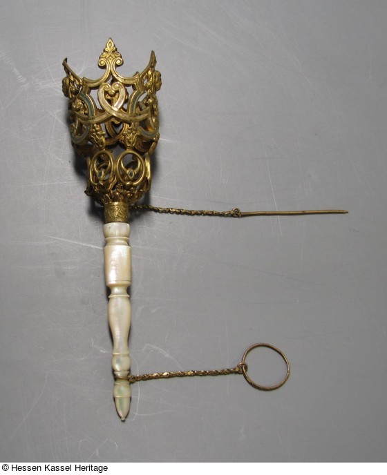 Bronzeblech vergoldet, gedrückt. Kaltemail, Stiel aus Perlmutt. |