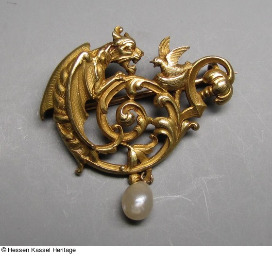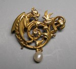 Durchbrochene, asymmetrische Brosche in Gestalt eines Drachen, der ein Vögelchen anfaucht
