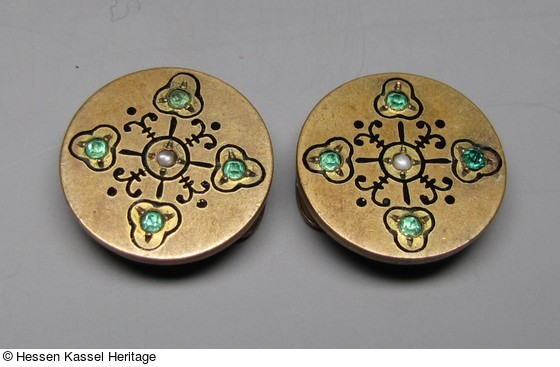 Messing vergoldet. Schwarzes Email, grüne Glassteine, facettiert. Barockperle. |