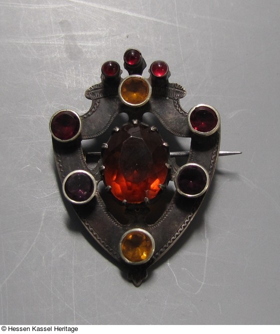 Silberne, schildförmige Brosche mit Farbsteinbesatz |