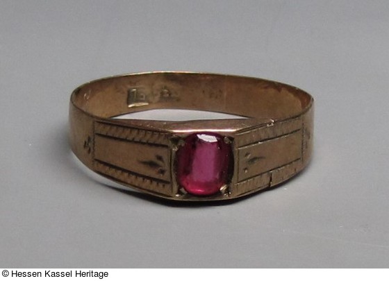 Gold, punziert, graviert, tremoliert. rosa Glasstein in Pavé-Fassung. |