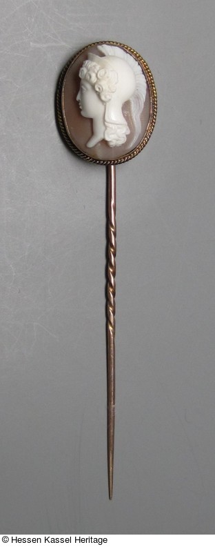 Muschelkamee, Silber, vergoldet, Stahlnadel. |