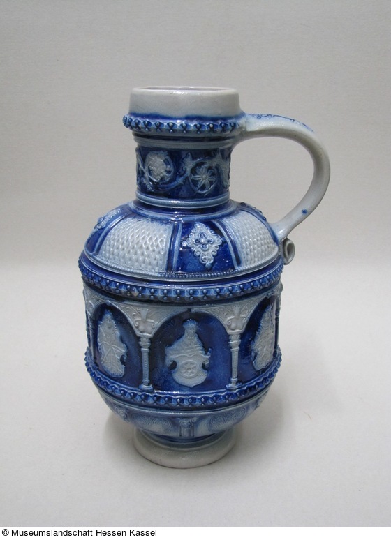 Steinzeug, hellgrauer Scherben in dreiteilige Form gedreht, profiliert ausgedrehter Fuß, Standring, Relief- und Prägedekor mit Kobaltsmalte bemalt, salzglasiert.