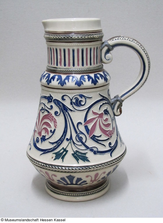 Feinsteinzeug, elfenbeinfarbener Scherben in die dreiteilige Form gedreht, Fadenrelief und Prägedekor dunkelbraun, schwarz, dunkelblau, dunkelgrün und altrosa ausgemalt, transparente Steingutglasur.