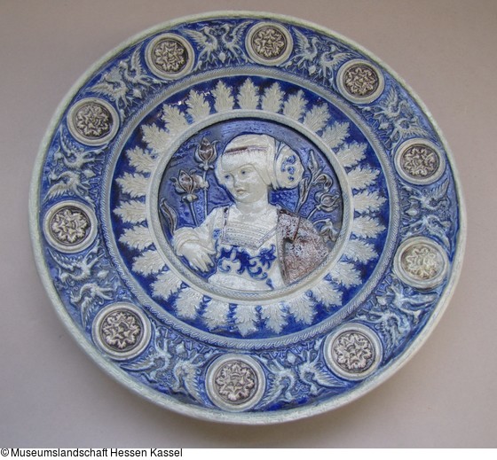 Steinzeug, grauer Scherben, über die Form gedreht, Reliefdekor mit Mangan- und Kobaltsmalte ausgelegt, salzglasiert. Im Standring Löcher für die Aufhängung. |