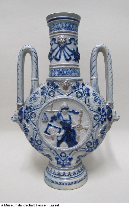Steinzeugvase mit Doppelhenkel und Justitia-Motiv |
