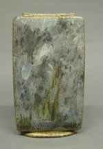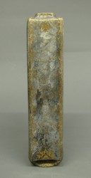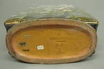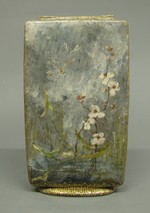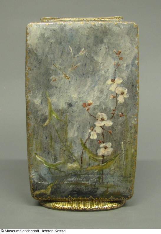 Fayence, rotbrauner Scherben, Barbotine-Malerei, transparente Bleiglasur, Vergoldung. |