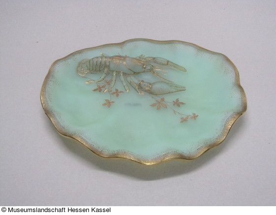 Hellblaues Opalglas, formgepreßt,auf der Oberseite hellgrün gefärbt und durch Ätzung aufgerauht. Goldhöhung. |