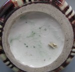 Porzellan, im Model geformt (eine senkrecht verlaufende Naht bildet am Fuß kleine Brandrisse), hochgebrannte Laufglasur auf der Basis von reduziertem Kupferoxyd. |