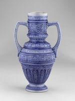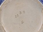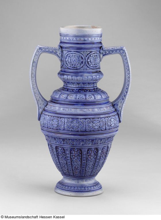 Steinzeug, grauer Scherben in die dreiteilige Form gedreht, Standring, Henkel aus der Form, Reliefdekor mit Kobaltsmalte ausgelegt, salzglasiert.