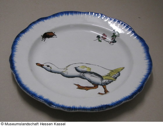 Fayence, weißer Fond. Blauer gekämmter Rand, Gans in Hellgrau, Braun und Gelb, Maikäfer, kleine Blattranken mit zwei Blüten. Die schwarze Zeichnung gedruckt, die Farbe über einer Schablone von Hand gemalt. |