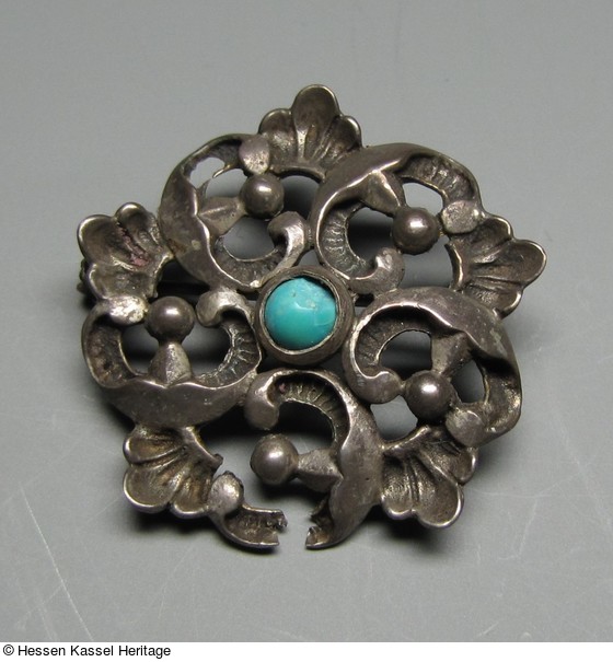 Silberne durchbrochene Brosche in form einer Blüte mit Türkis |